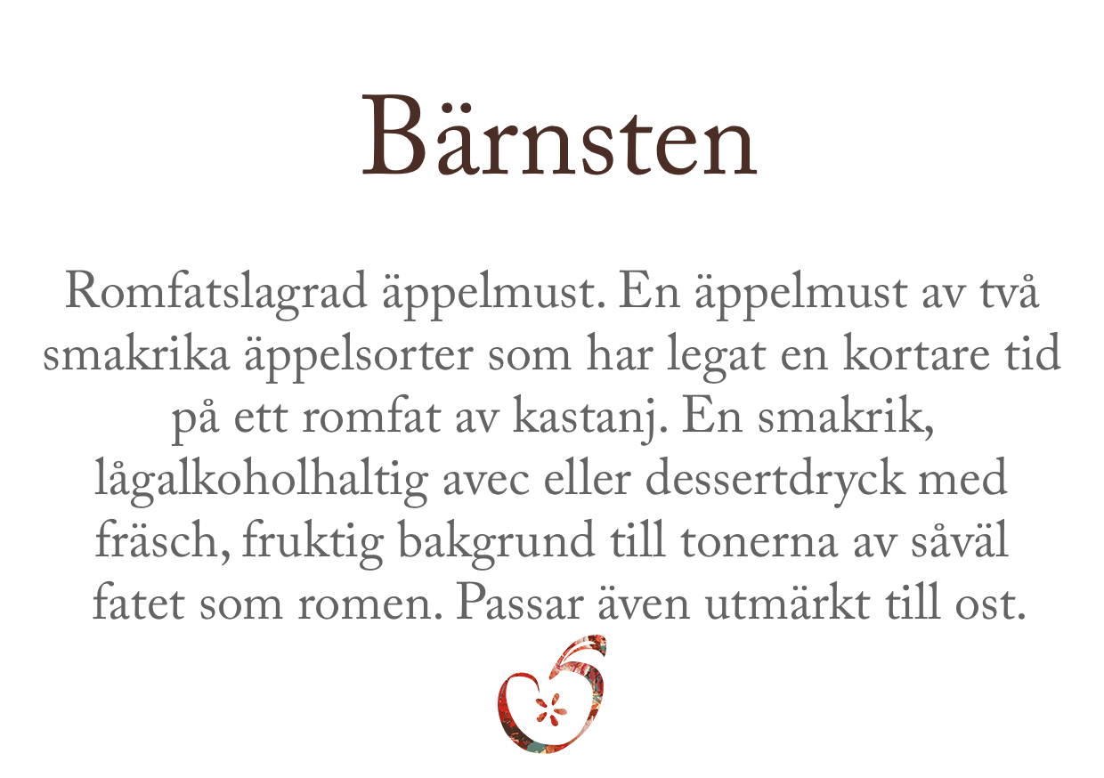 Romfatslagrad äppelmust. En äppelmust av två smakrika äppelsorter som fått smak av ett romfat av kastanj. En smakrik, lågalkoholhaltig avec eller dessertdryck med fräsch, fruktig bakgrund till tonerna av såväl fatet som romen. Passar även utmärkt till ost.